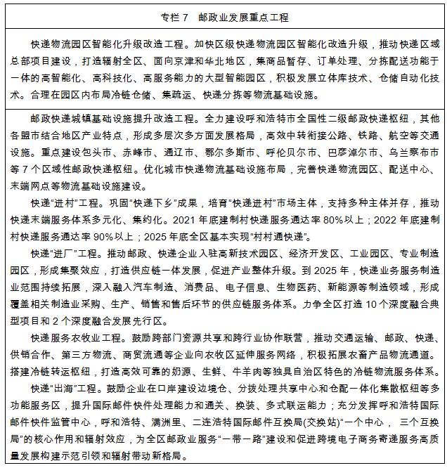 提升郵政快遞服務(wù)水平。建成深入城鄉(xiāng)、輻射國際、運(yùn)轉(zhuǎn)高效、綠色安全的郵政快遞服務(wù)網(wǎng)絡(luò),構(gòu)建“1+1+11+2”(建成1個國際性的呼和浩特“三關(guān)合一”新國際快件監(jiān)管中心、1個全國性的呼和浩特市郵政快遞樞紐、11個區(qū)域性的盟市郵政快遞樞紐以及滿洲里、二連浩特2個口岸型國際郵政快遞樞紐)郵政快遞樞紐交換網(wǎng)。推動京東亞洲一號智能物流園、中通快遞集團(tuán)內(nèi)蒙古區(qū)(呼和浩特)智能科技電商快遞產(chǎn)業(yè)園、申通快遞物流產(chǎn)業(yè)園、圓通內(nèi)蒙區(qū)域總部基地、韻達(dá)內(nèi)蒙古快遞電商總部基地、郵政新機(jī)場省級分撥中心等一批區(qū)域總部項目建設(shè),推動盟市郵政快遞區(qū)域樞紐建設(shè)。實(shí)施郵政快遞基礎(chǔ)設(shè)施提升改造工程,重點(diǎn)在老舊小區(qū)完善智能信包箱、郵政快遞綜合服務(wù)站等基礎(chǔ)設(shè)施,在新建小區(qū)布放智能快遞箱,建設(shè)標(biāo)準(zhǔn)綜合服務(wù)站,提升郵件快件處理能力和末端收寄服務(wù)水平。升級農(nóng)村牧區(qū)服務(wù)網(wǎng)絡(luò),重點(diǎn)建設(shè)80個旗縣(市、區(qū))集散中心,提升農(nóng)村牧區(qū)網(wǎng)點(diǎn)標(biāo)準(zhǔn)化、規(guī)范化水平,鼓勵在旗縣級集散中心的建設(shè)和運(yùn)營中開展郵快合作、快快合作、快商合作、交快合作等合作模式推進(jìn)快遞進(jìn)村,到2025年全區(qū)基本實(shí)現(xiàn)“村村通快遞”。
