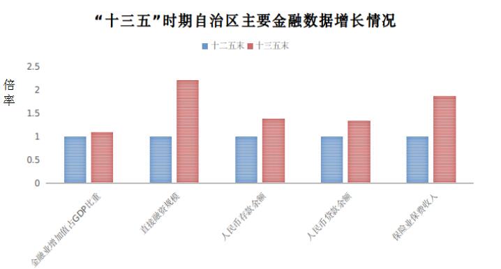 金融總體實(shí)力進(jìn)一步增強(qiáng)?!笆濉睍r(shí)期,全區(qū)金融業(yè)增加值占GDP的比重從2015年的4.8%增長(zhǎng)到2020年的5.1%,對(duì)經(jīng)濟(jì)社會(huì)發(fā)展的貢獻(xiàn)度進(jìn)一步提高。銀行業(yè)存貸款規(guī)模穩(wěn)步提高,全區(qū)金融機(jī)構(gòu)人民幣存款余額由2015年末的1.8萬(wàn)億元增長(zhǎng)到2020年末的2.5萬(wàn)億元,年均增幅6.79%;貸款余額由1.7萬(wàn)億元增長(zhǎng)到2.3萬(wàn)億元,年均增幅6.23%。保險(xiǎn)業(yè)保費(fèi)收入持續(xù)增長(zhǎng),由2015年末的395.5億元增加至2020年末的740億元,年均增幅13.35%。利用資本市場(chǎng)取得積極進(jìn)展,2020年直接融資規(guī)模突破2000億元大關(guān),達(dá)到2643.5億元,占社會(huì)融資規(guī)模比重逐年提高?!笆濉逼陂g,新增1家公司在香港上市,1家公司進(jìn)入全國(guó)首批新三板精選層。截至2020年末,全區(qū)共有境內(nèi)上市公司26家,香港上市公司6家,新三板掛牌公司50家。