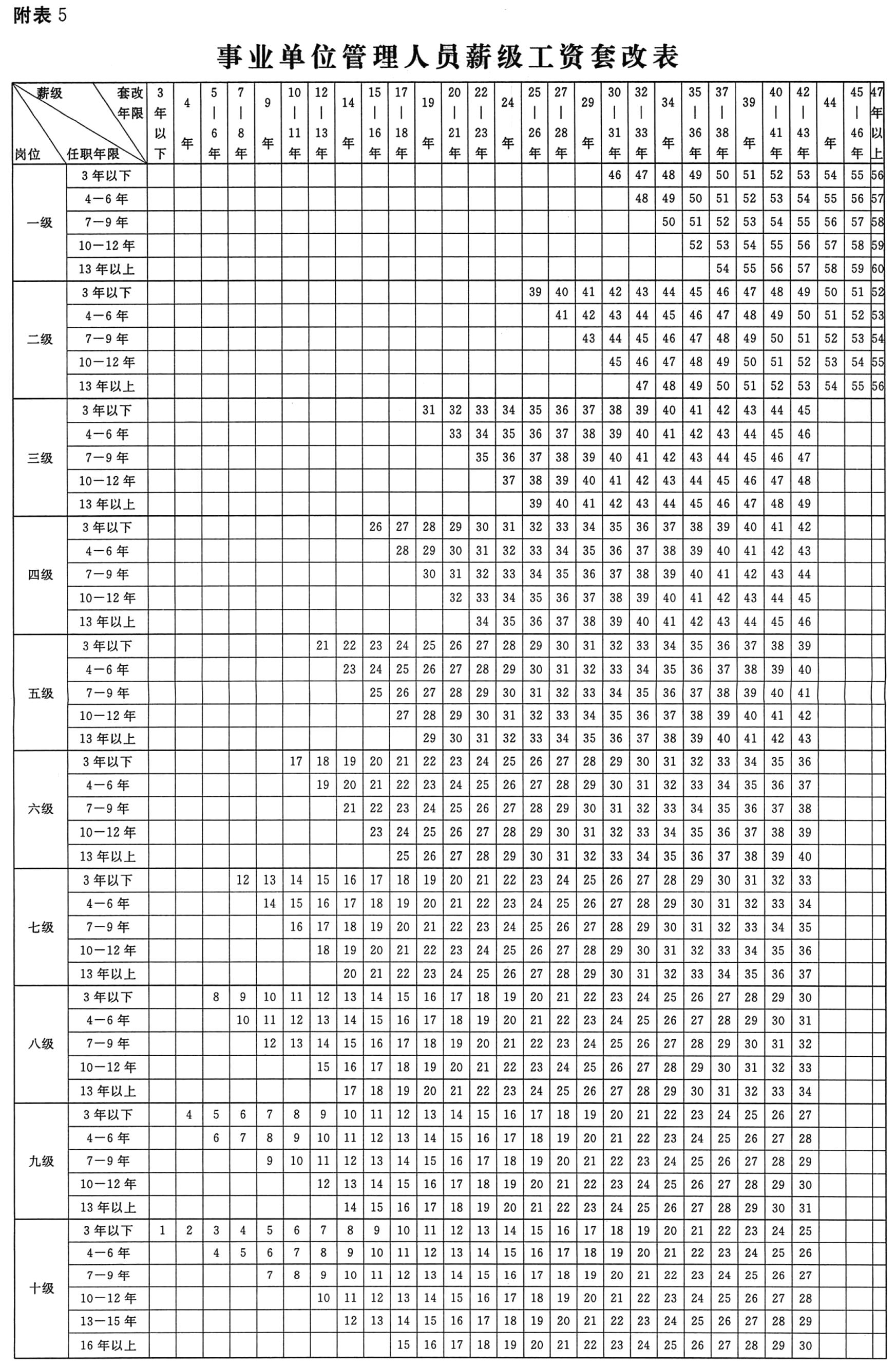 薪級工資主要體現(xiàn)工作人員的工作表現(xiàn)和資歷。對專業(yè)技術人員和管理人員設置65個薪級,對工人設置40個薪級,每個薪級對應一個工資標準(見附表1至3)。對不同崗位規(guī)定不同的起點薪級。工作人員按照本人套改年限、任職年限和所聘崗位,結合工作表現(xiàn),套改相應的薪級工資(見附表4至6)。