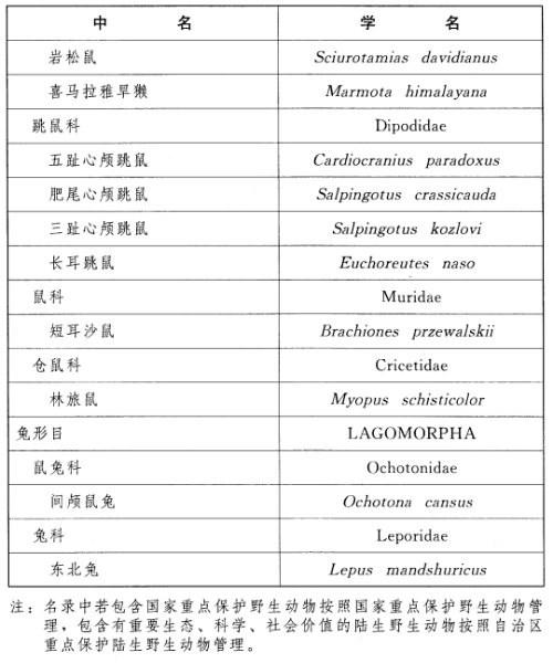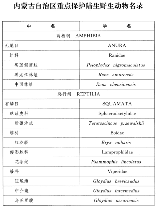 根據(jù)《中華人民共和國(guó)野生動(dòng)物保護(hù)法》相關(guān)規(guī)定,為明確我區(qū)珍貴、瀕危野生動(dòng)物種類(lèi),經(jīng)自治區(qū)人民政府同意,現(xiàn)將《內(nèi)蒙古自治區(qū)重點(diǎn)保護(hù)陸生野生動(dòng)物名錄》予以公布,請(qǐng)結(jié)合實(shí)際,進(jìn)一步做好野生動(dòng)物保護(hù)和管理工作。