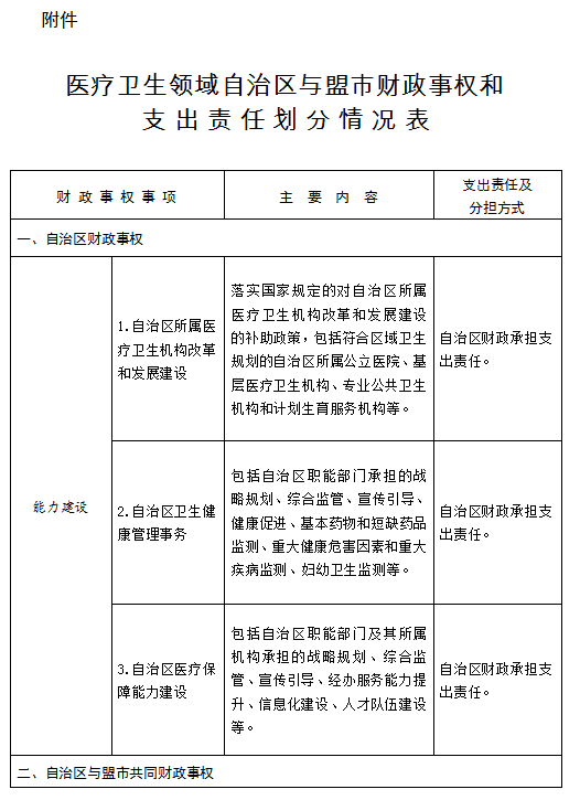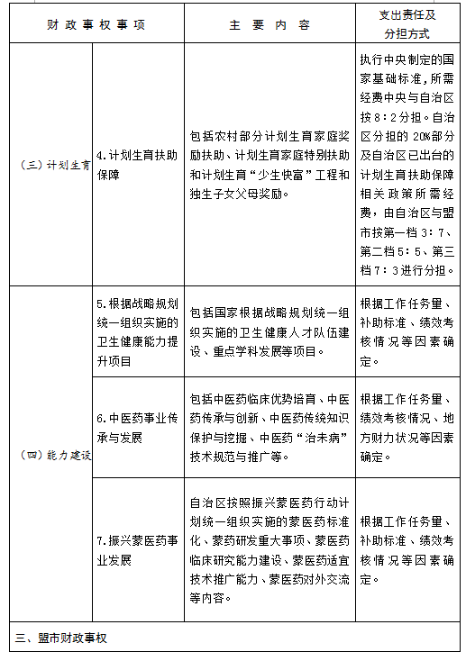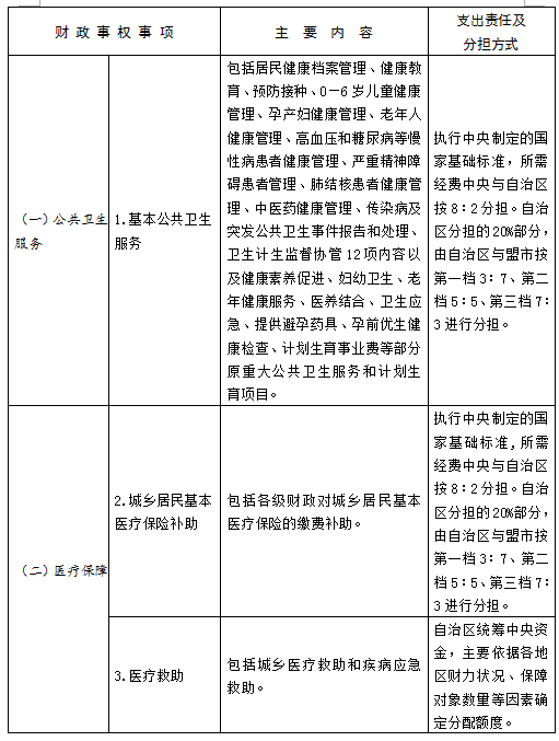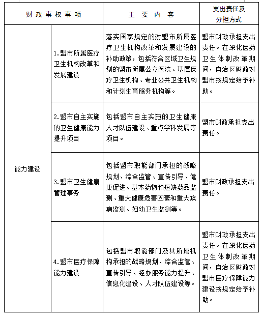 從公共衛(wèi)生、醫(yī)療保障、計(jì)劃生育、能力建設(shè)四個(gè)方面,劃分自治區(qū)與盟市財(cái)政事權(quán)和支出責(zé)任。