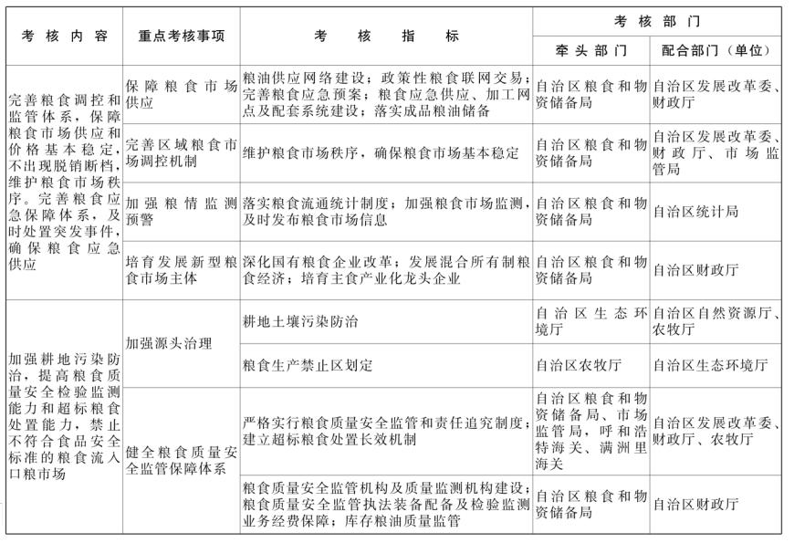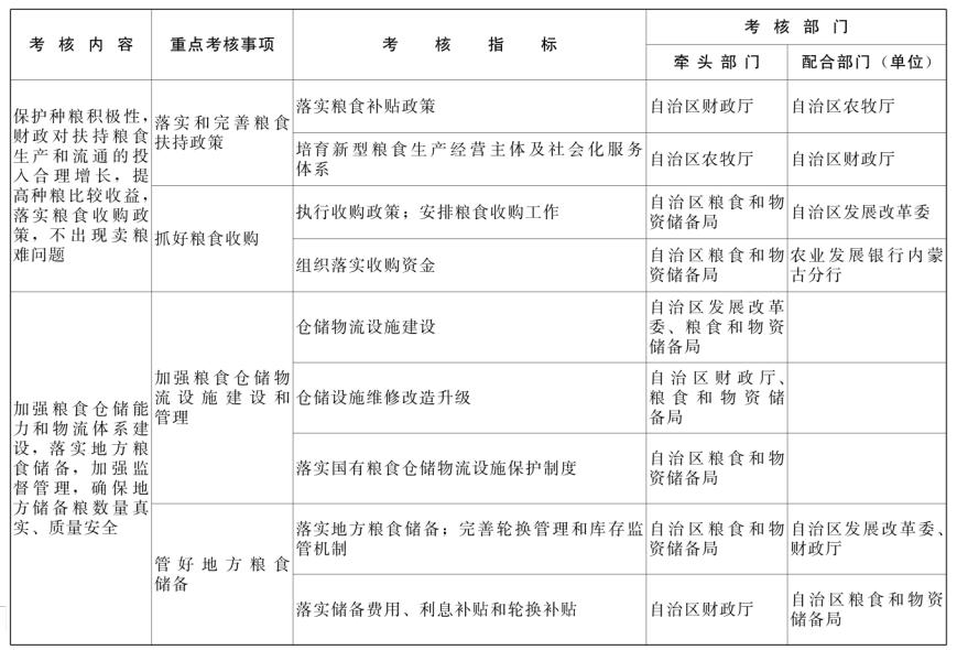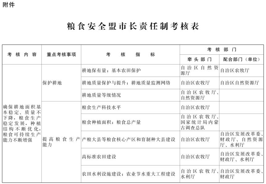 第六條??糧食安全盟市長責任制考核內容包括增強糧食可持續(xù)生產能力、保護種糧積極性、增強地方糧食儲備能力、保障糧食市場供應、確保糧食質量安全、落實保障措施等6個方面,由各牽頭部門具體落實(詳見附件)。