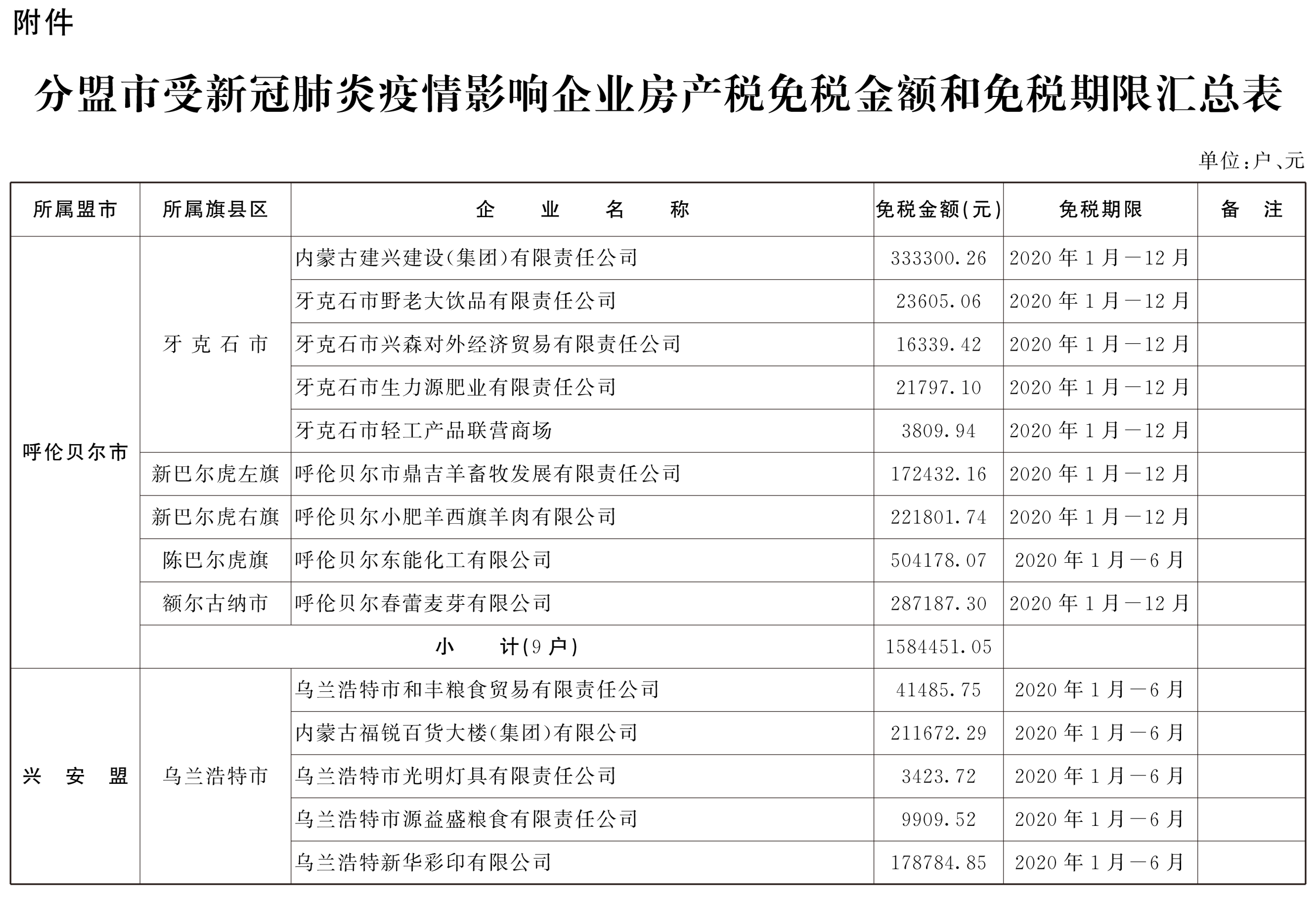 一、同意免征呼倫貝爾市、興安盟、鄂爾多斯市、烏海市、阿拉善盟、滿(mǎn)洲里市、二連浩特市80戶(hù)受新冠肺炎疫情影響企業(yè)應(yīng)納房產(chǎn)稅合計(jì)29515151.89元。其中,呼倫貝爾市9戶(hù),免稅1584451.05元;興安盟19戶(hù),免稅9971750.23元;鄂爾多斯市8戶(hù),免稅3498302.95元;烏海市12戶(hù),免稅 5768027.50元;阿拉善盟13戶(hù),免稅1801397.39元;滿(mǎn)洲里市16戶(hù),免稅6497574.09元;二連浩特市3戶(hù),免稅393648.68元。具體免稅企業(yè)名稱(chēng)、免稅金額和免稅期限見(jiàn)附件。