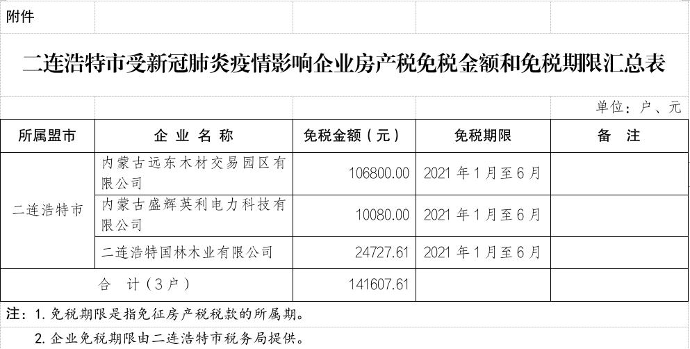 附件:二連浩特市受新冠肺炎疫情影響企業(yè)房產(chǎn)稅免稅金額和免稅期限匯總表