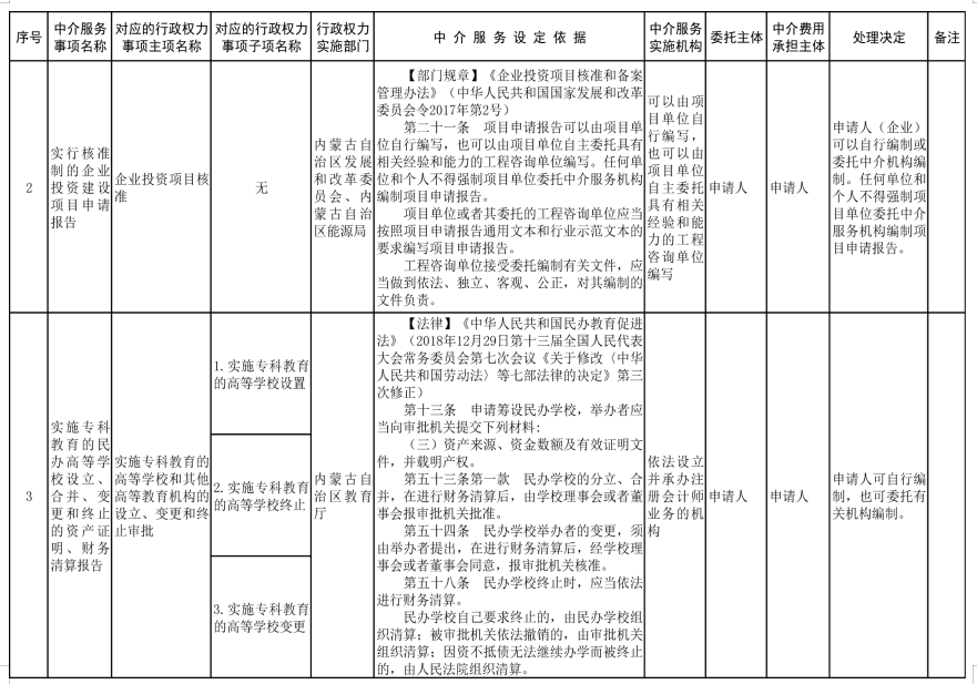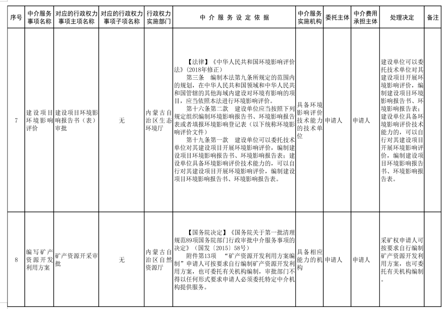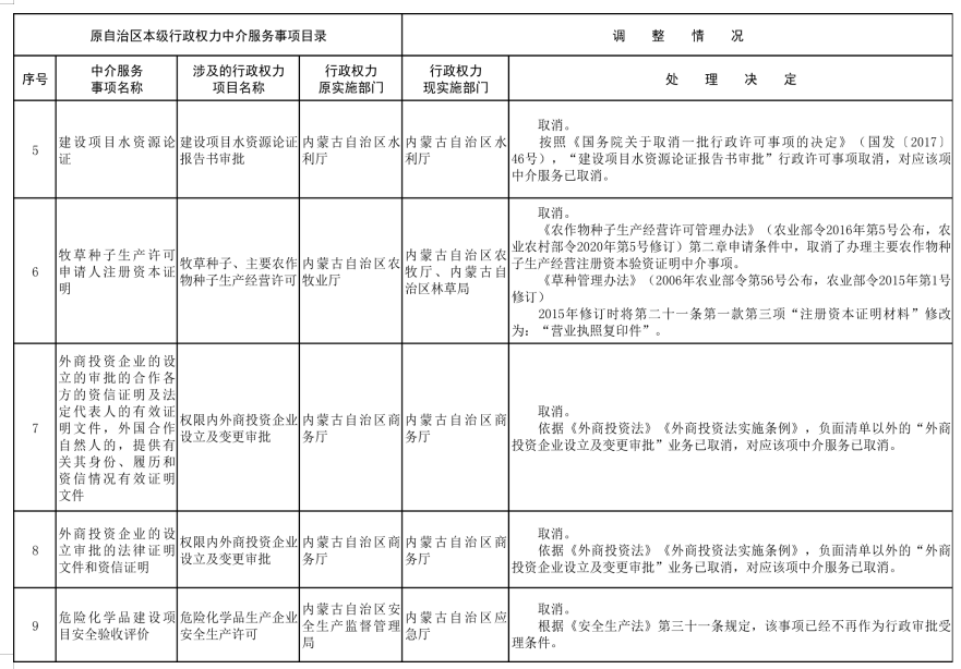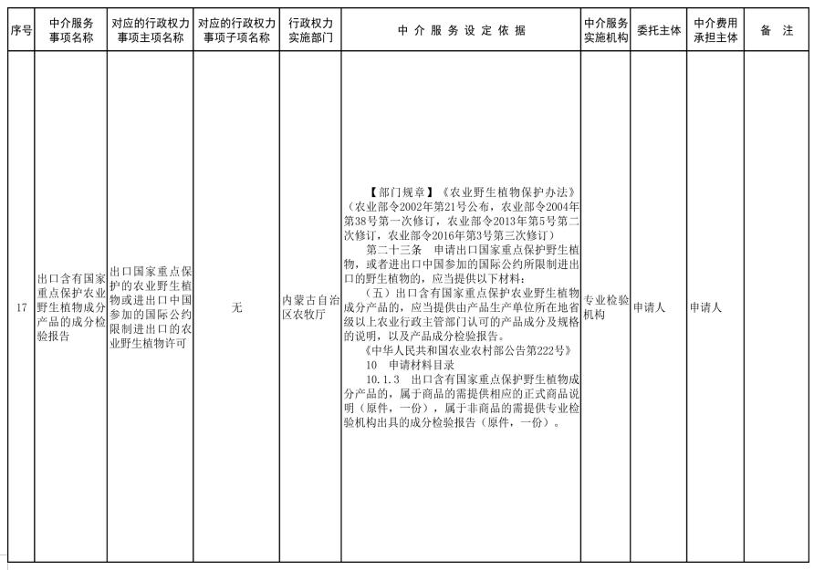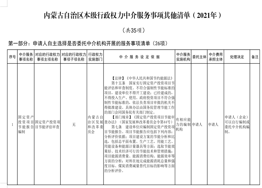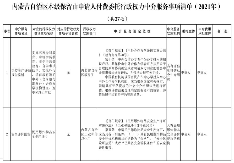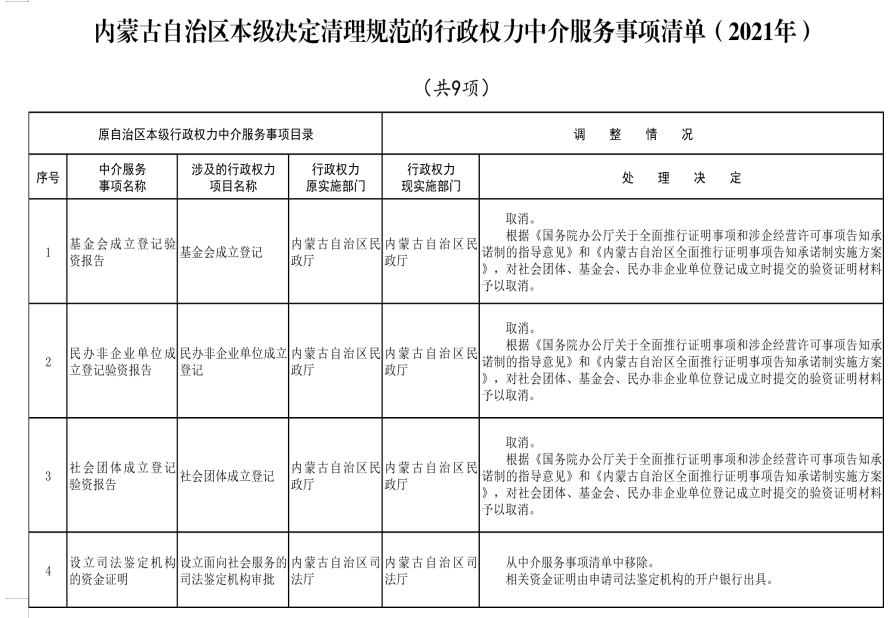 為規(guī)范行政權力中介服務行為,促進中介服務市場健康發(fā)展,按照《優(yōu)化營商環(huán)境條例》(國務院令第722號)、《國務院辦公廳關于清理規(guī)范國務院部門行政審批中介服務的通知》(國辦發(fā)〔2015〕31號)、《國務院關于第三批清理規(guī)范國務院部門行政審批中介服務事項的決定》(國發(fā)〔2017〕8號)等法規(guī)文件精神及自治區(qū)黨委和政府相關工作要求,經對自治區(qū)本級各部門開展行政審批、備案等工作中涉及的中介服務事項進行清理和規(guī)范,現將《內蒙古自治區(qū)本級保留由申請人付費委托行政權力中介服務事項清單(2021年)》《內蒙古自治區(qū)本級行政權力中介服務事項其他清單(2021年)》(第一部分申請人自主選擇是否委托中介機構開展的服務事項清單和第二部分審批部門付費委托中介機構開展的服務事項清單)、《內蒙古自治區(qū)本級決定清理規(guī)范的行政權力中介服務事項清單(2021年)》印發(fā)給你們,并提出以下意見,請一并貫徹落實。