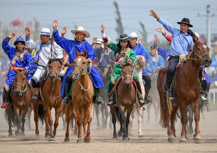 2024年8月18日,在第25屆8·18哲里木賽馬節(jié)開幕式上,通遼市各旗縣市區(qū)牧民代表騎馬入場(chǎng)。